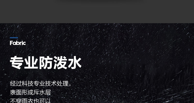 防潑水科技面料,類似荷葉效果,有效的阻擋小雨對人體運動的干擾,保持干爽舒適